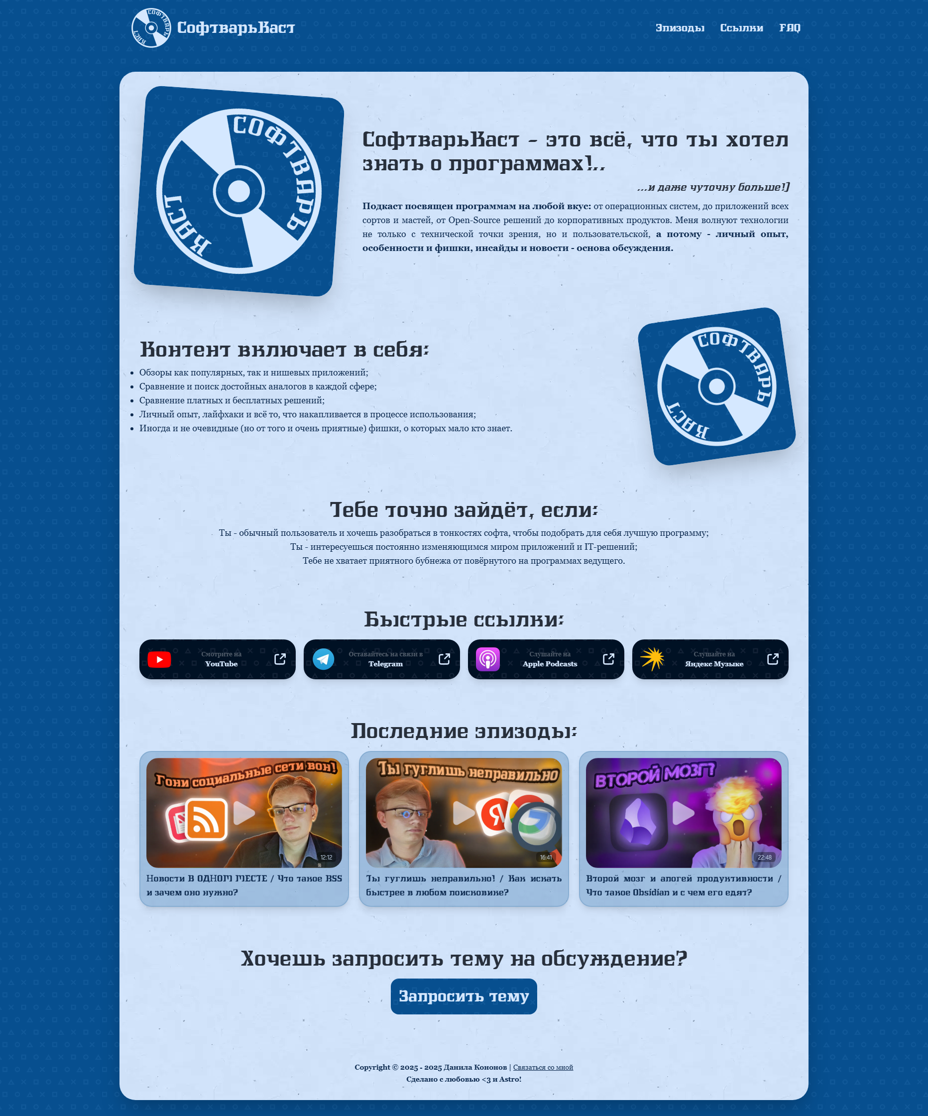 Теперь на главной есть четыре самые популярные и важные ссылки (YouTube, Telegram, Apple Podcasts и Яндекс Музыка), а также три последних эпизода, список которых, разумеется, автоматически обновляется вместе с выходом эпизодов.